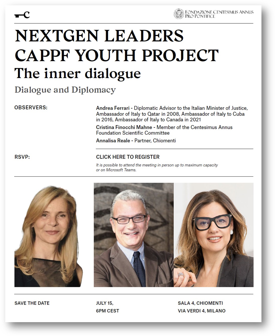 During the session Cristina Finocchi Mahne, Member of the CAPPF Scientific Committee and Board Member of listed companies, and Annalisa Reale, Partner at Chiomenti, will foster the discussion among you – NextGen Responsible Leaders Under 35, connected from various countries.