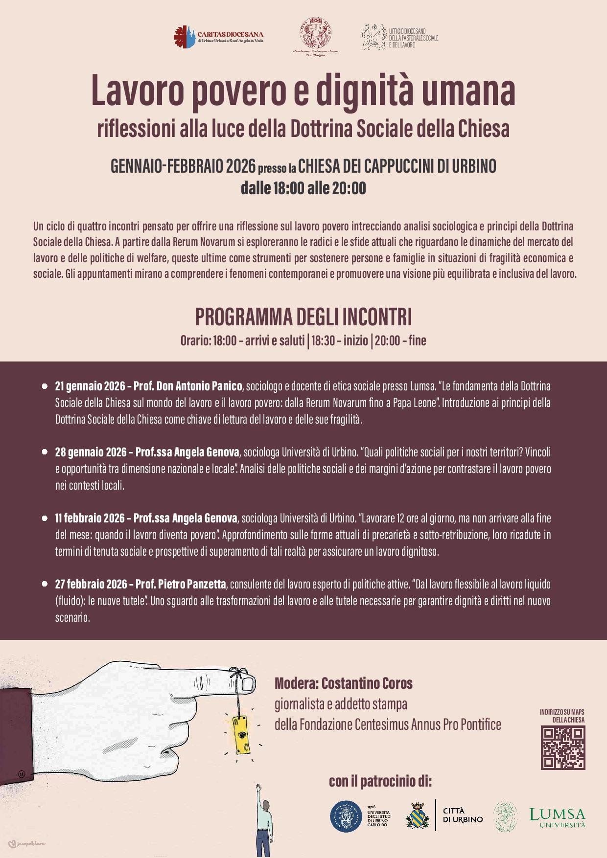 Nel cuore di Urbino, presso la Chiesa dei Cappuccini, prende forma un percorso di approfondimento e dialogo su uno dei temi più urgenti del nostro tempo: il lavoro povero e la sua incidenza sulla dignità della persona. Il ciclo di incontri, intitolato “Lavoro povero e dignità umana: riflessioni alla luce della Dottrina Sociale della Chiesa”, si svolgerà nei mesi di gennaio e febbraio 2026 e si articolerà in quattro appuntamenti serali, dalle ore 18:00 alle 20:00.